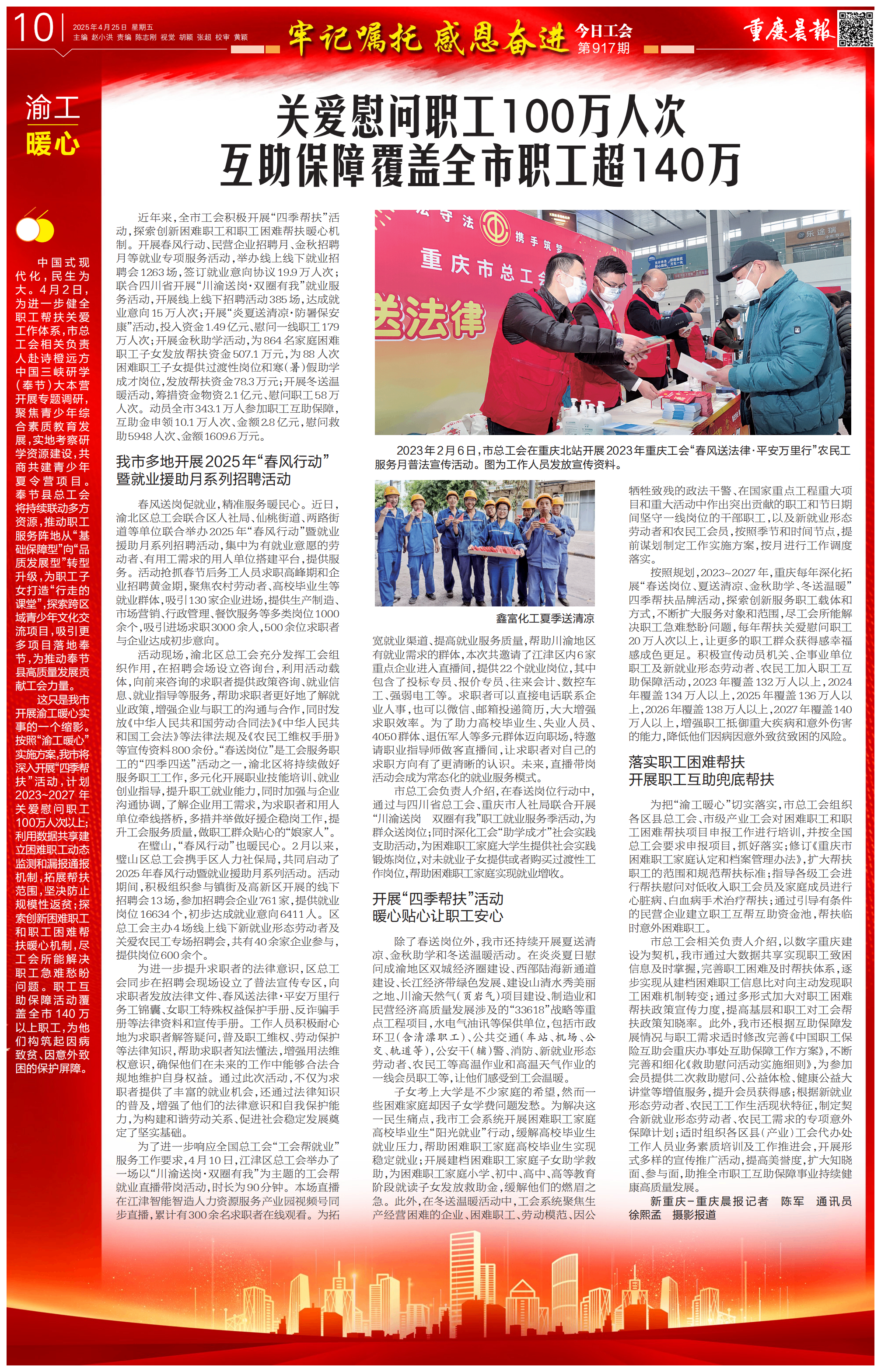 这只是我市开展渝工暖心实事的一个缩影。按照“渝工暖心”实施方案,我市将深入开展“四季帮扶”活动,计划2023~2027年关爱慰问职工100万人次以上;利用数据共享建立困难职工动态监测和漏报通报机制,拓展帮扶范围,坚决防止规模性返贫;探索创新困难职工和职工困难帮扶暖心机制,尽工会所能解决职工急难愁盼问题。职工互助保障活动覆盖全市140万以上职工,为他们构筑起因病致贫、因意外致困的保护屏障。
