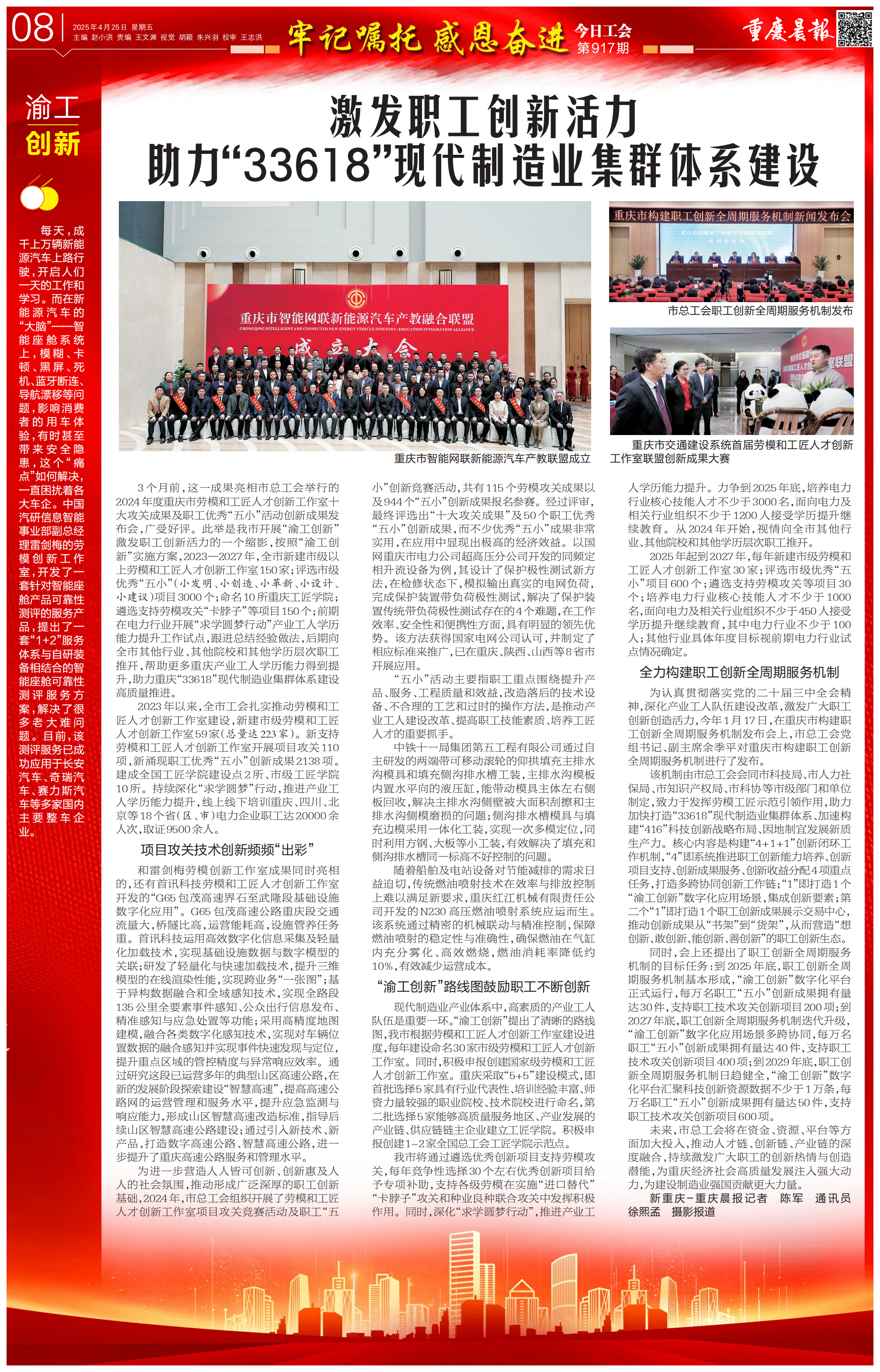 3个月前,这一成果亮相市总工会举行的2024年度重庆市劳模和工匠人才创新工作室十大攻关成果及职工优秀“五小”活动创新成果发布会,广受好评。此举是我市开展“渝工创新”激发职工创新活力的一个缩影,按照“渝工创新”实施方案,2023—2027年,全市新建市级以上劳模和工匠人才创新工作室150家;评选市级优秀“五小”(小发明、小创造、小革新、小设计、小建议)项目3000个;命名10所重庆工匠学院;遴选支持劳模攻关“卡脖子”等项目150个;前期在电力行业开展“求学圆梦行动”产业工人学历能力提升工作试点,跟进总结经验做法,后期向全市其他行业、其他院校和其他学历层次职工推开,帮助更多重庆产业工人学历能力得到提升,助力重庆“33618”现代制造业集群体系建设高质量推进。