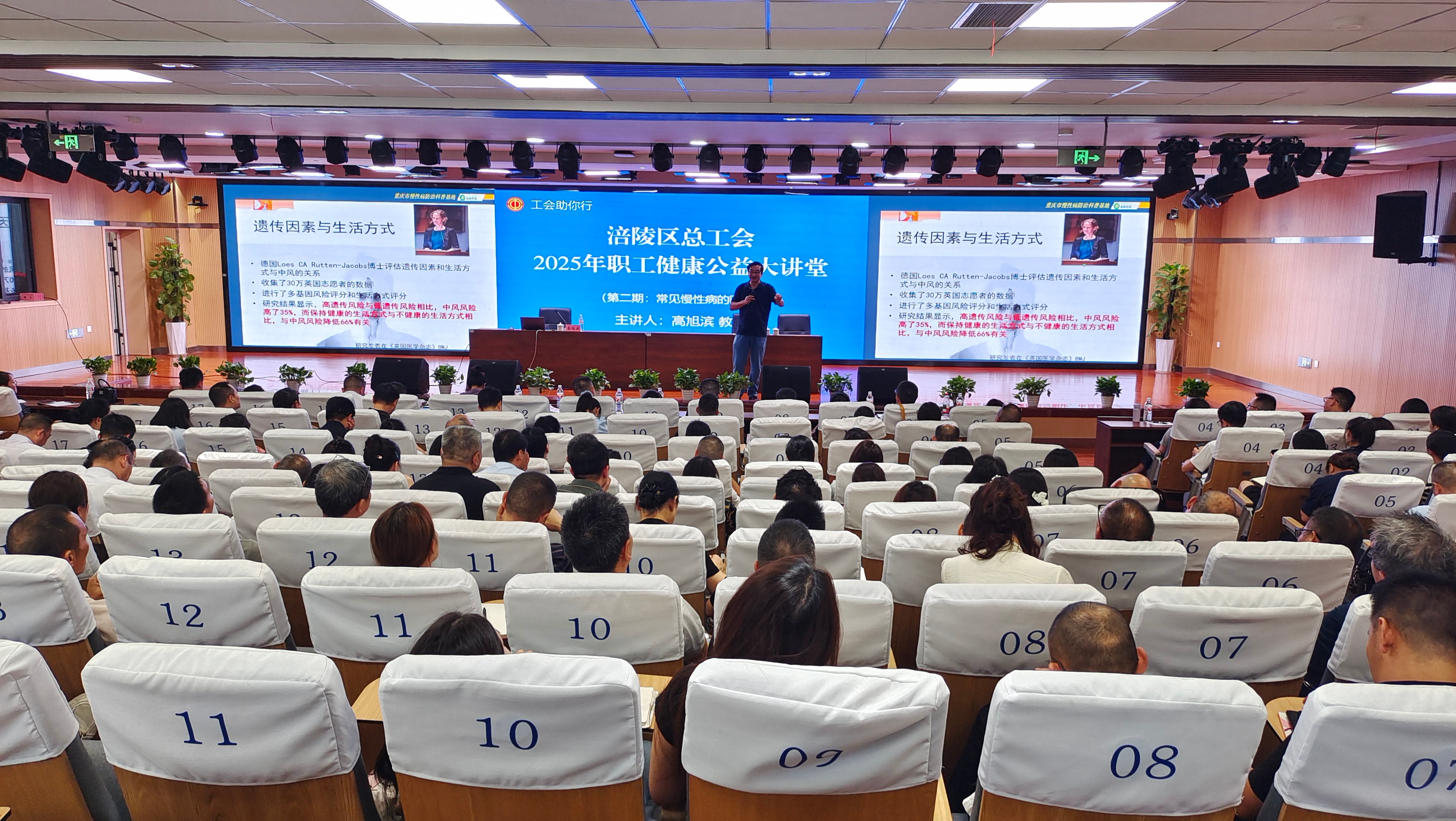 活动邀请到新桥医院身心健康管理专家高旭滨教授主讲“常见慢性病的防治”。高教授以幽默开场白调动气氛,围绕高血压、糖尿病等教职工常见慢性病,结合生活案例,用通俗语言讲解病因、症状及防治方法。他分享的贴合生活的运动方式等内容,让复杂知识变得易懂。讲座中,高教授还与教职工积极互动,耐心解答大家关于慢性病预防、饮食和运动保健的疑问,现场氛围融洽。