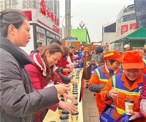 1月17日,永川区中山路街道玉清社区工会于华茂商圈“红蜂驿站”举办冬日送温暖活动,为快递员、外卖小哥、环卫工人、停车收费员、滴滴司机等新户外劳动者送去关怀。