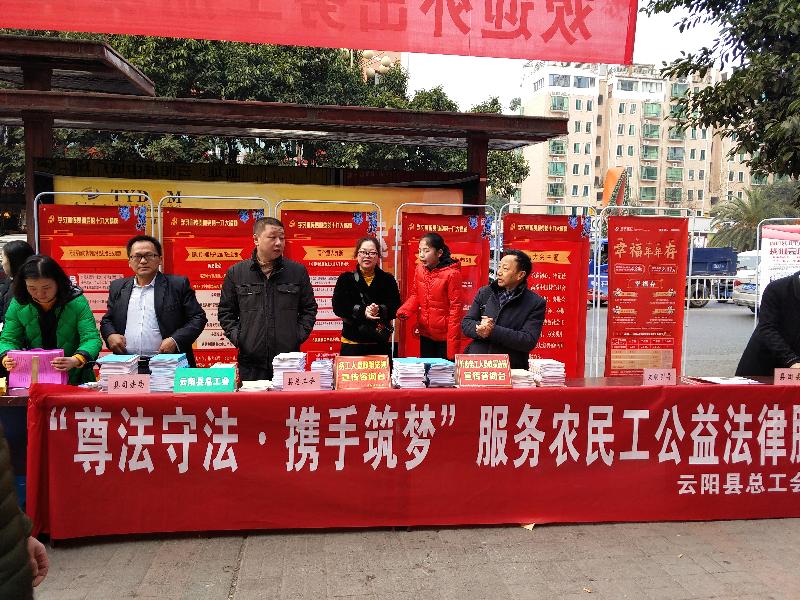 年关将至,农民工工资拖欠现象进入多发期。为学习宣传贯彻十九大精神,进一步做好新形势下为农民工服务的工作,加强对农民工朋友的人文关怀和法治宣传教育,2018年2月5日,由云阳县总工会、县委宣传部、县司法局等部门联合开展的“尊法守法·携手筑梦”农民工公益法律服务行动正式启动。