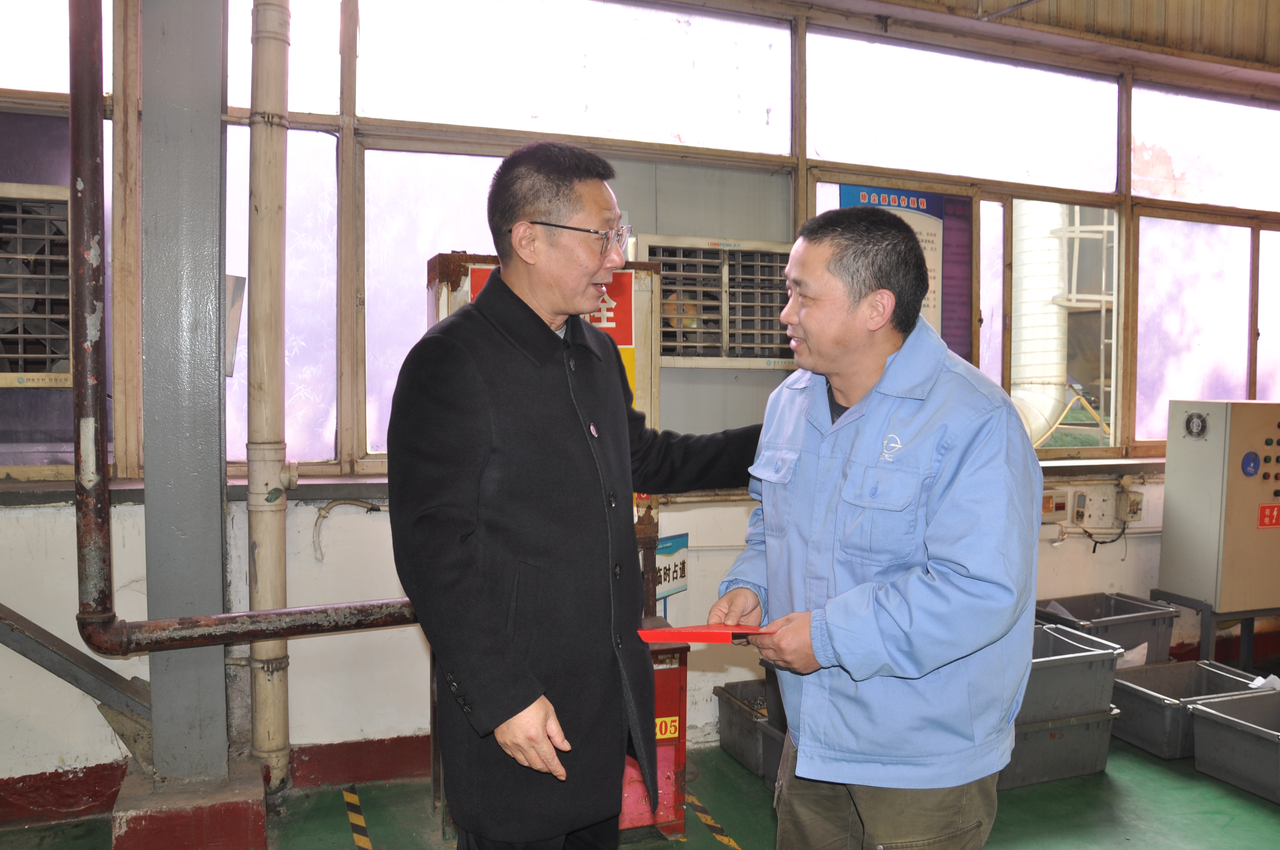 廖军主席一行深入车间的生产现场,为坚守在工作岗位上的一线困难职工送上了慰问信和新年祝福,希望他们在新的一年里,紧跟党走、增强信心、快乐工作、幸福生活。